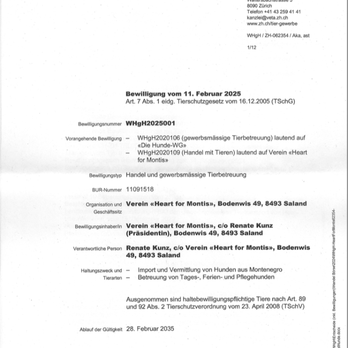 Februar 2025 „Good News“ unsere Handelsbewilligung wurde vom Veterinäramt des Kantons Zürich um weitere 10 Jahre verlängert.