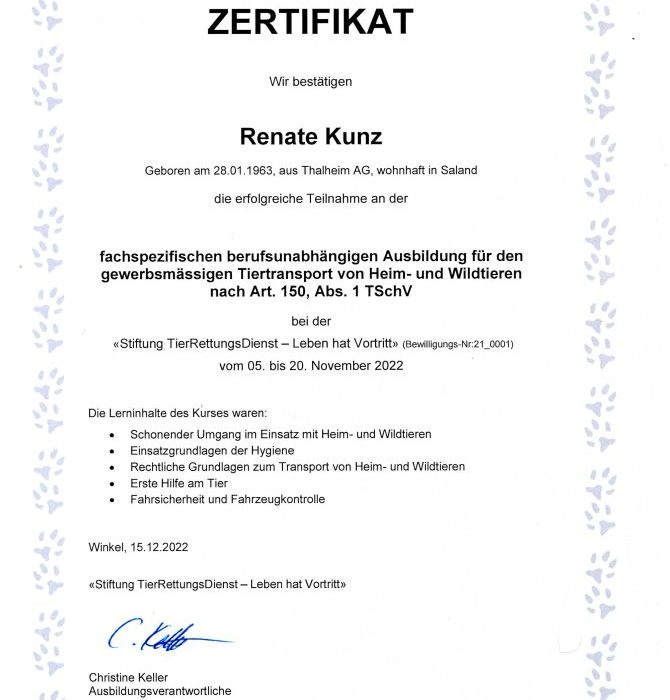 28. März 2023 Unsere Vereinspräsidentin Renate hat im November 2022 den FbA Transportkurs absolviert und im Dezember mit Prüfung abgeschlossen und bestanden. Das Zürcher Veterinäramt hat unserem Verein daraufhin...